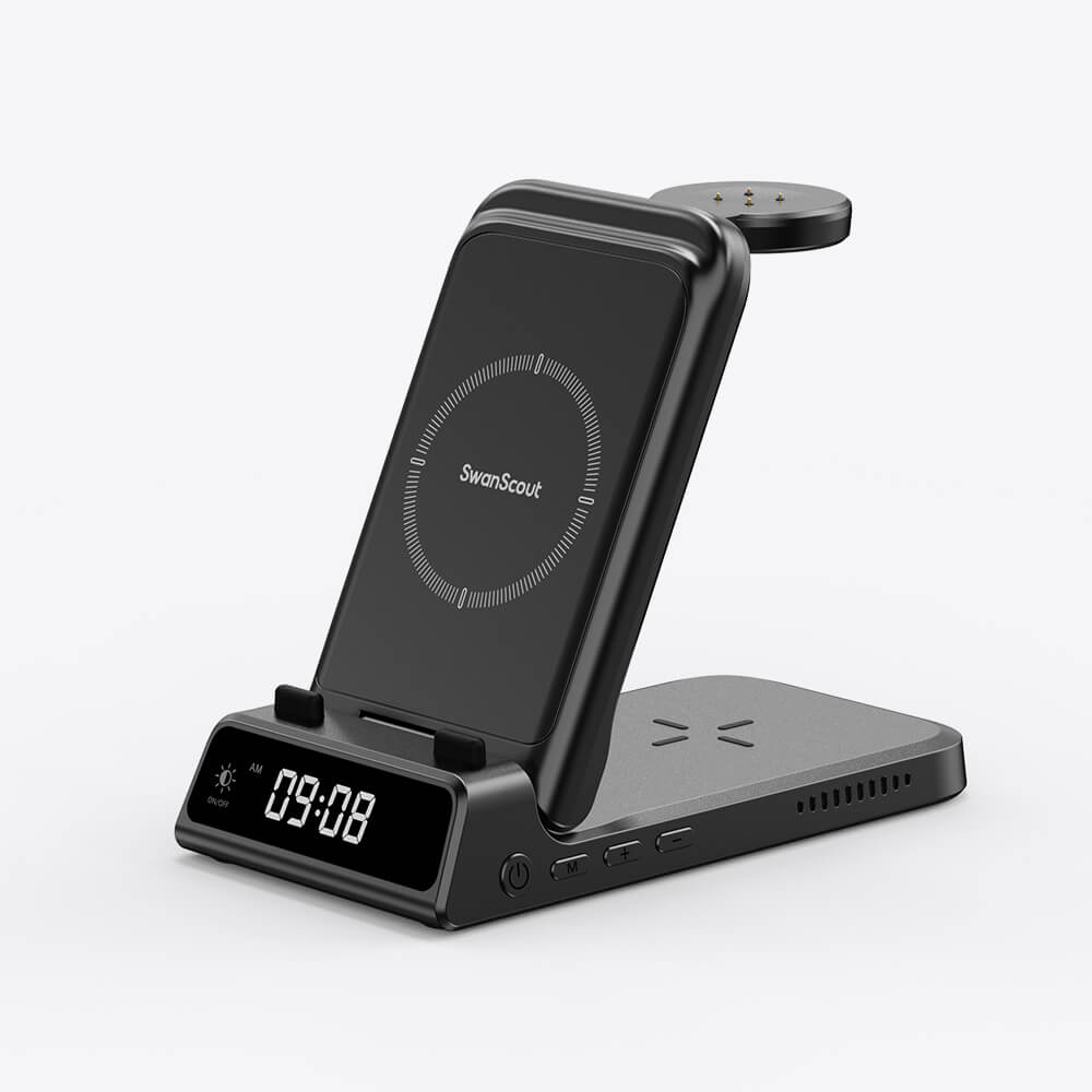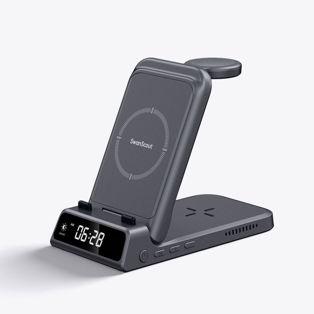 SwanScout 502M is a slim, 2-in-1 magnetic wireless charger compatible with Apple devices.The SwanScout 502M combines a sleek 2 in one clock phone charger design with an LED display and fast charging for daily convenience.