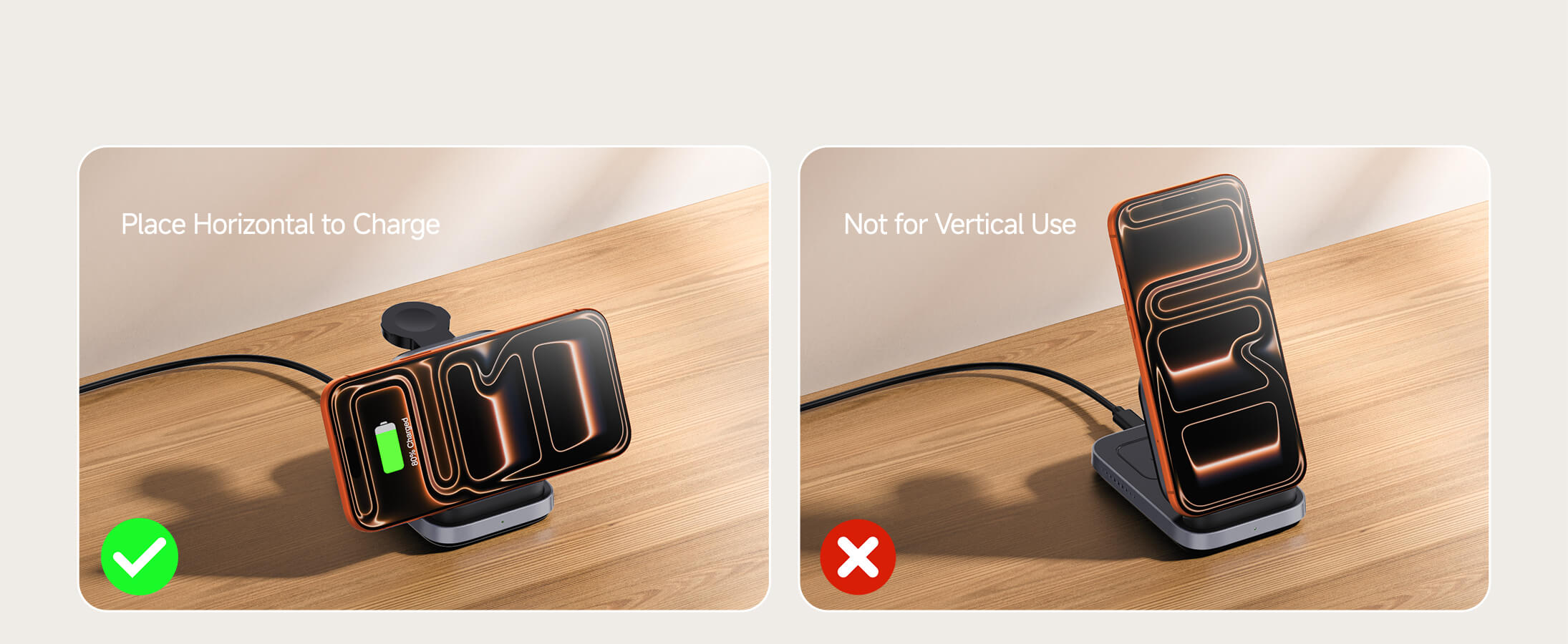 - Horizontales Laden des Smartphones: Laden Sie Ihr Smartphone im Querformat für komfortables Ansehen von Videos oder Surfen während des Ladevorgangs.
