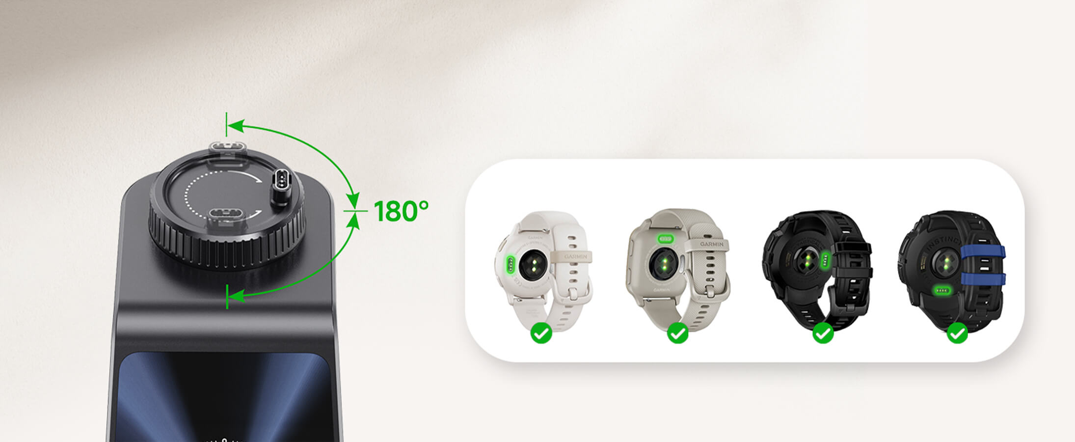 • Γυριστός φορτιστής ρολογιού: Διαθέτει φορτιστή ρολογιού που περιστρέφεται 180°, ιδανικό για διάφορα μοντέλα ρολογιών Garmin.