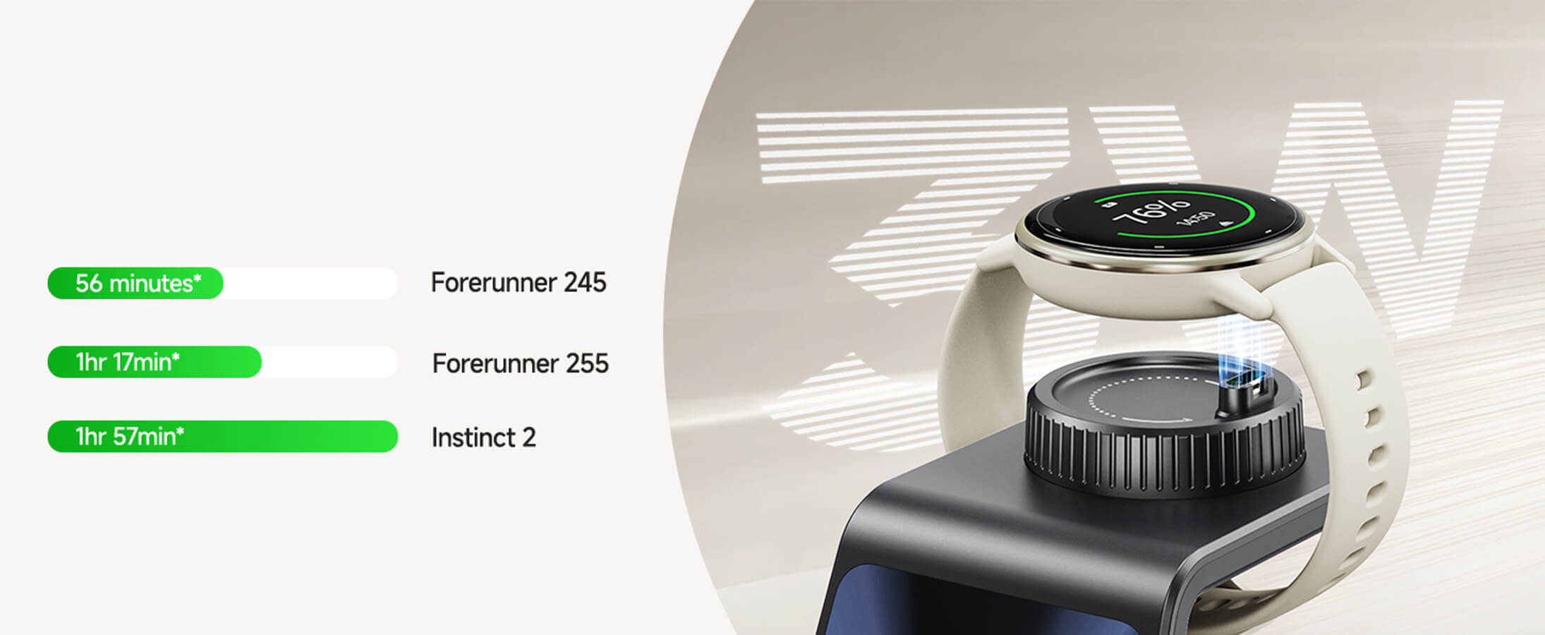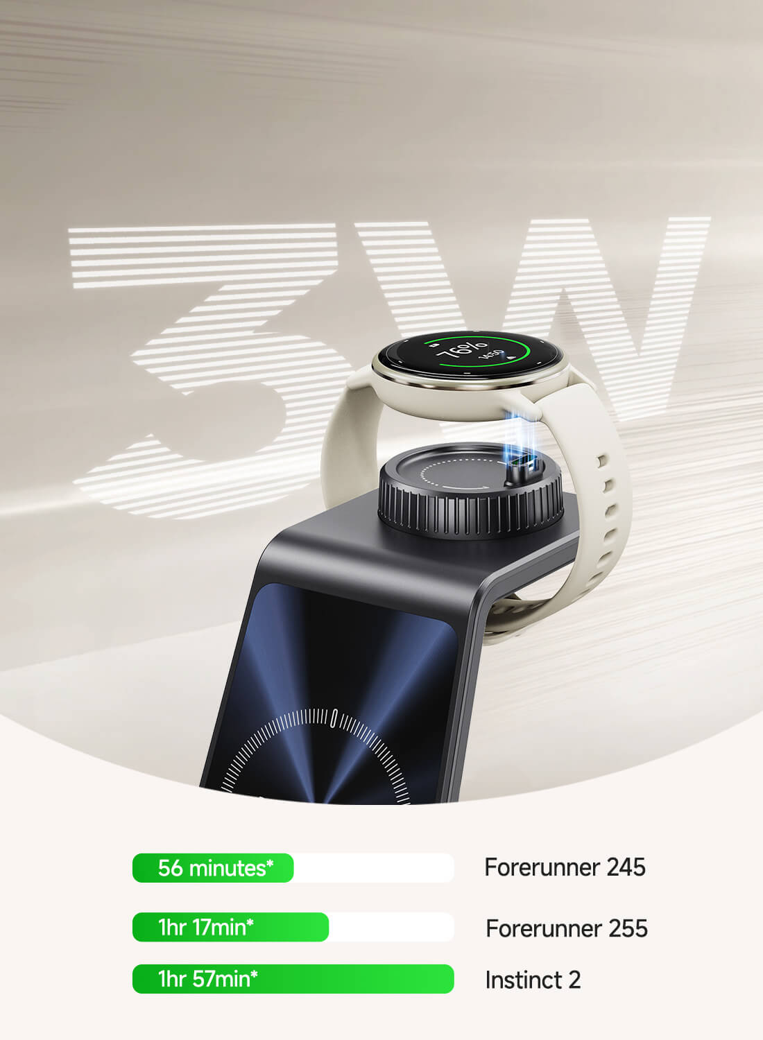 • Φορτιστής 3 σε 1 ασύρματης φόρτισης: Φορτίζει ταυτόχρονα ένα ρολόι Garmin, ένα τηλέφωνο με ασύρματη φόρτιση και ένα ζευγάρι ασύρματων ακουστικών με θήκες φόρτισης, εξοικονομώντας χώρο.
