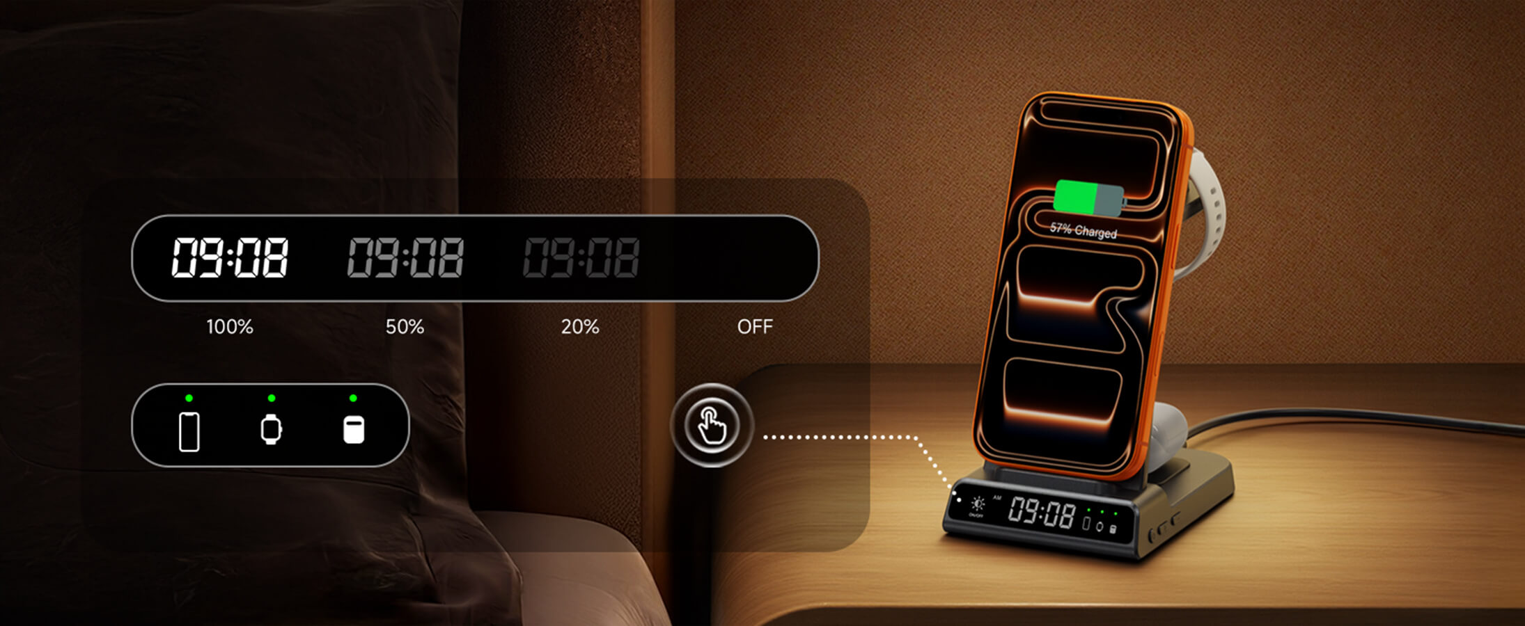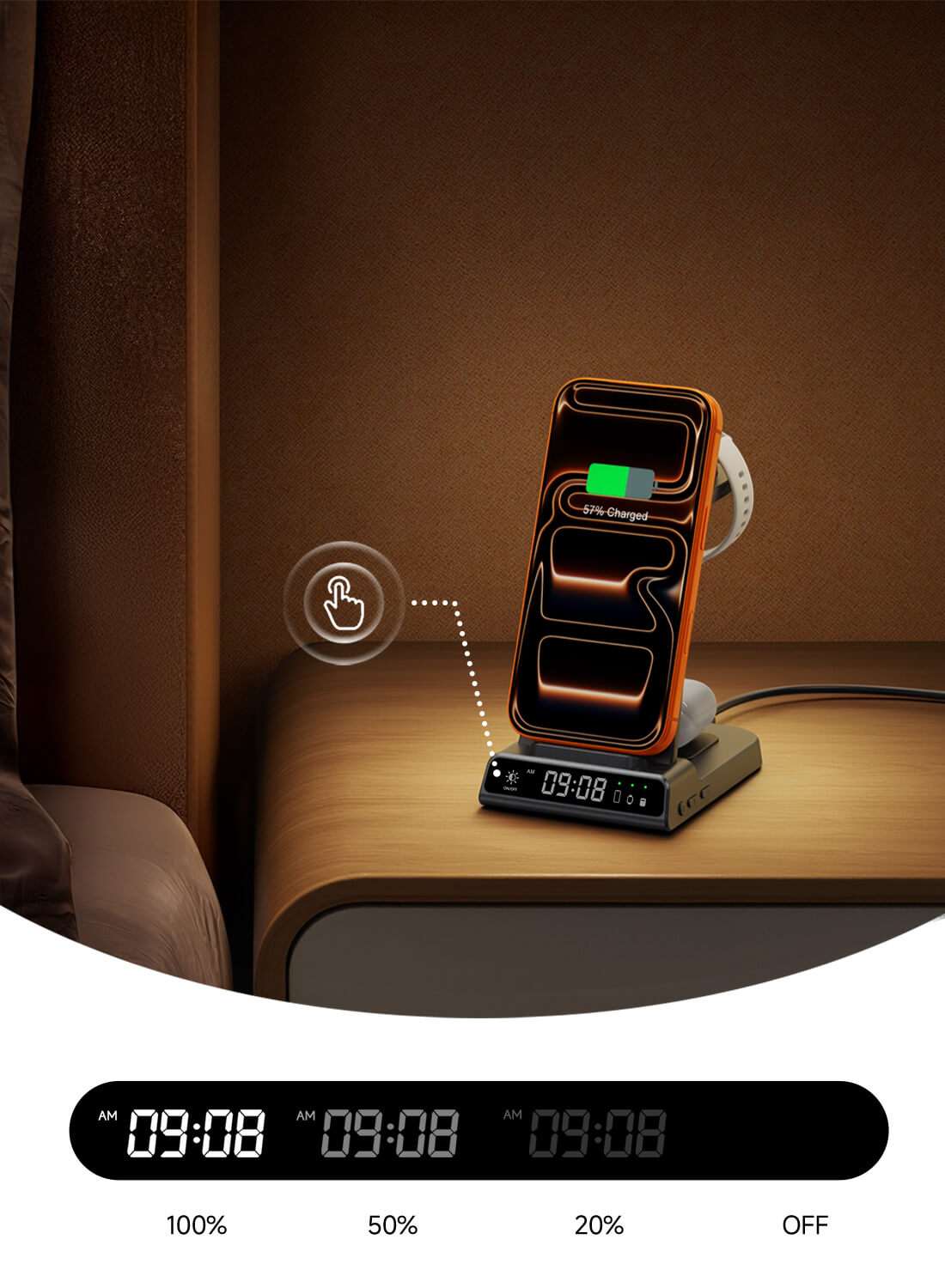 Ρολόι με ρυθμιζόμενη φωτεινότητα, ιδανικό για νυχτερινή εμφάνιση, εξασφαλίζοντας ότι οι συσκευές σας φορτίζονται πλήρως κάθε βράδυ
