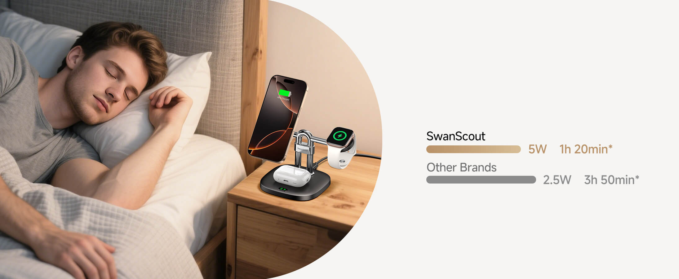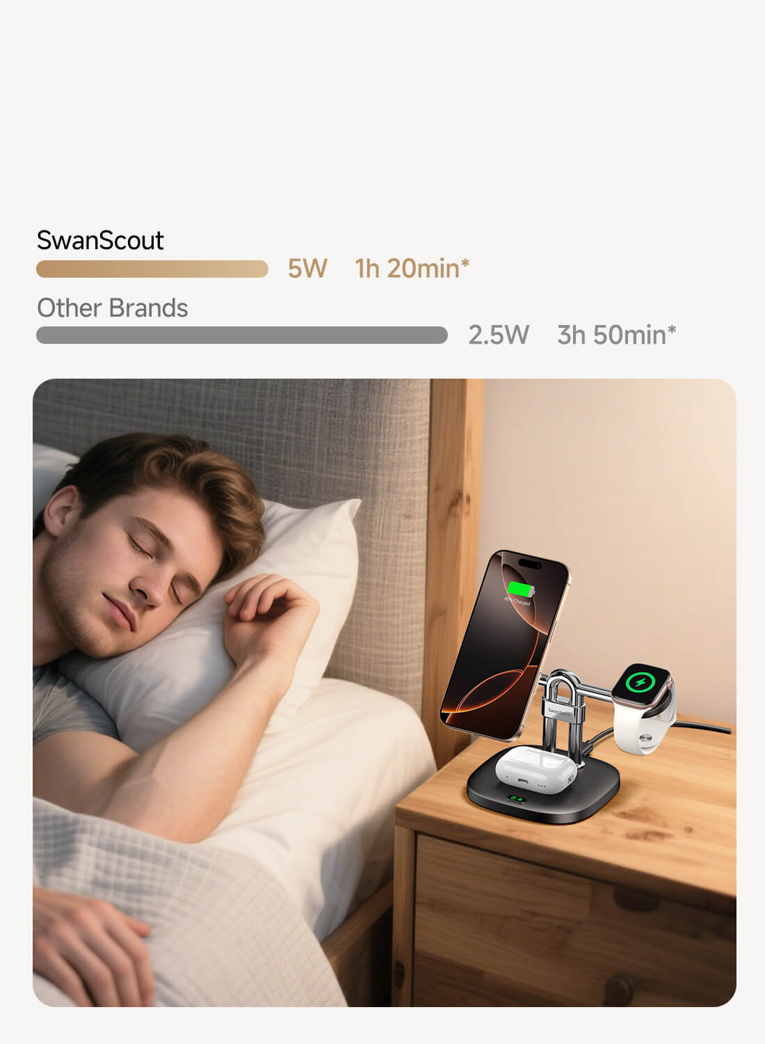 • Enjoy 5W fast charging for Apple Watch, reaching 80% in just 51 minutes—47% faster than standard 2.5W chargers.
