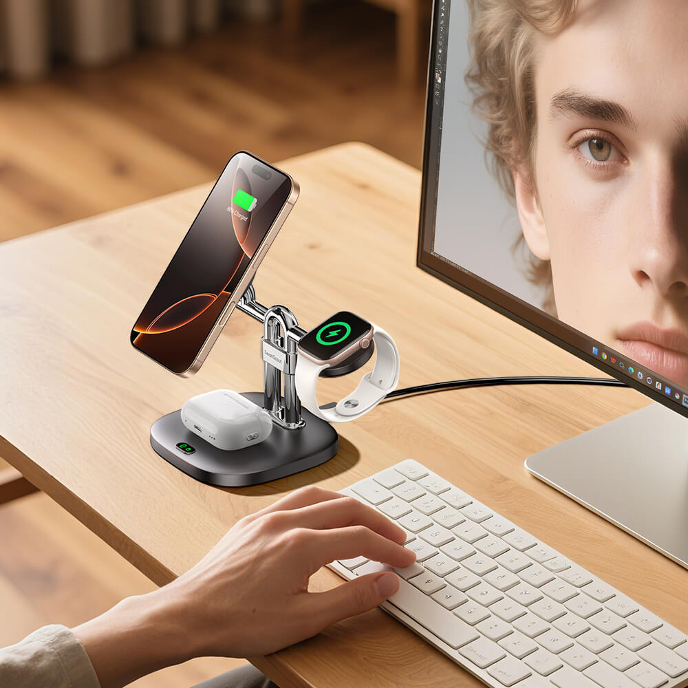 • Charge iPhone, Apple Watch, and AirPods simultaneously with MagSafe and wireless charging, keeping your space neat and cable-free.