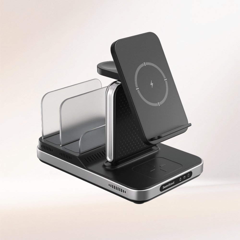 SwanScout 707S is a stable and elegant 3-in-1 wireless charger compatible with Samsung devices.The SwanScout 707S is a sleek Samsung wireless charging station built for daily efficiency and smart device organization.