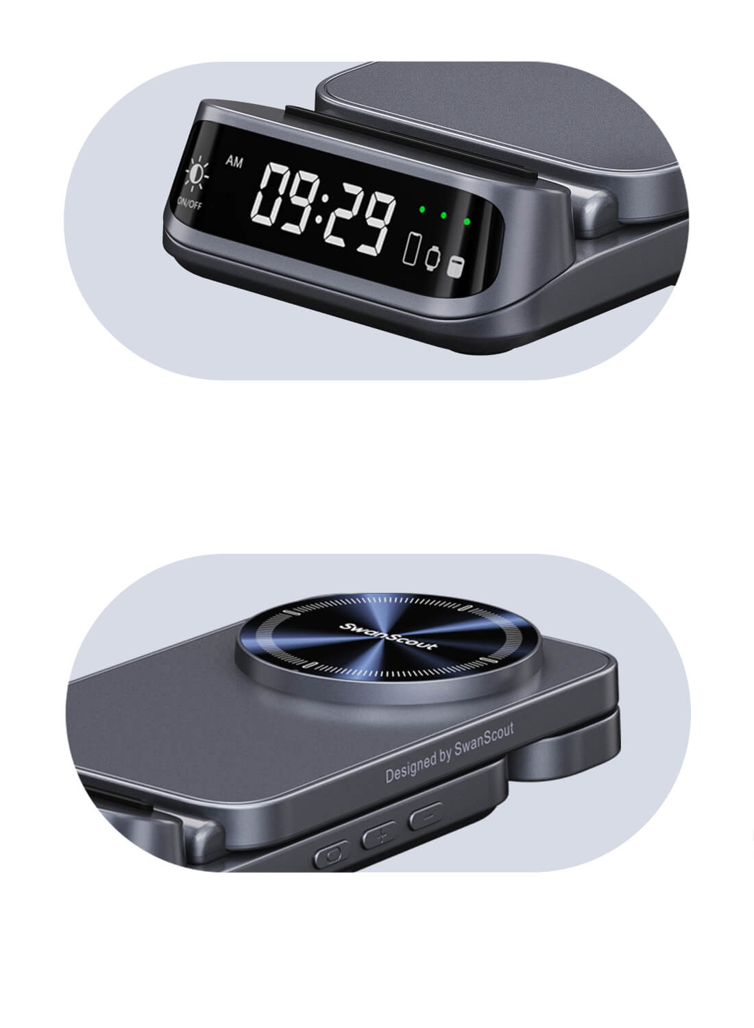 Ideale per l’uso sul comodino, con controllo touch silenzioso e funzioni combinate di ricarica e orologio.