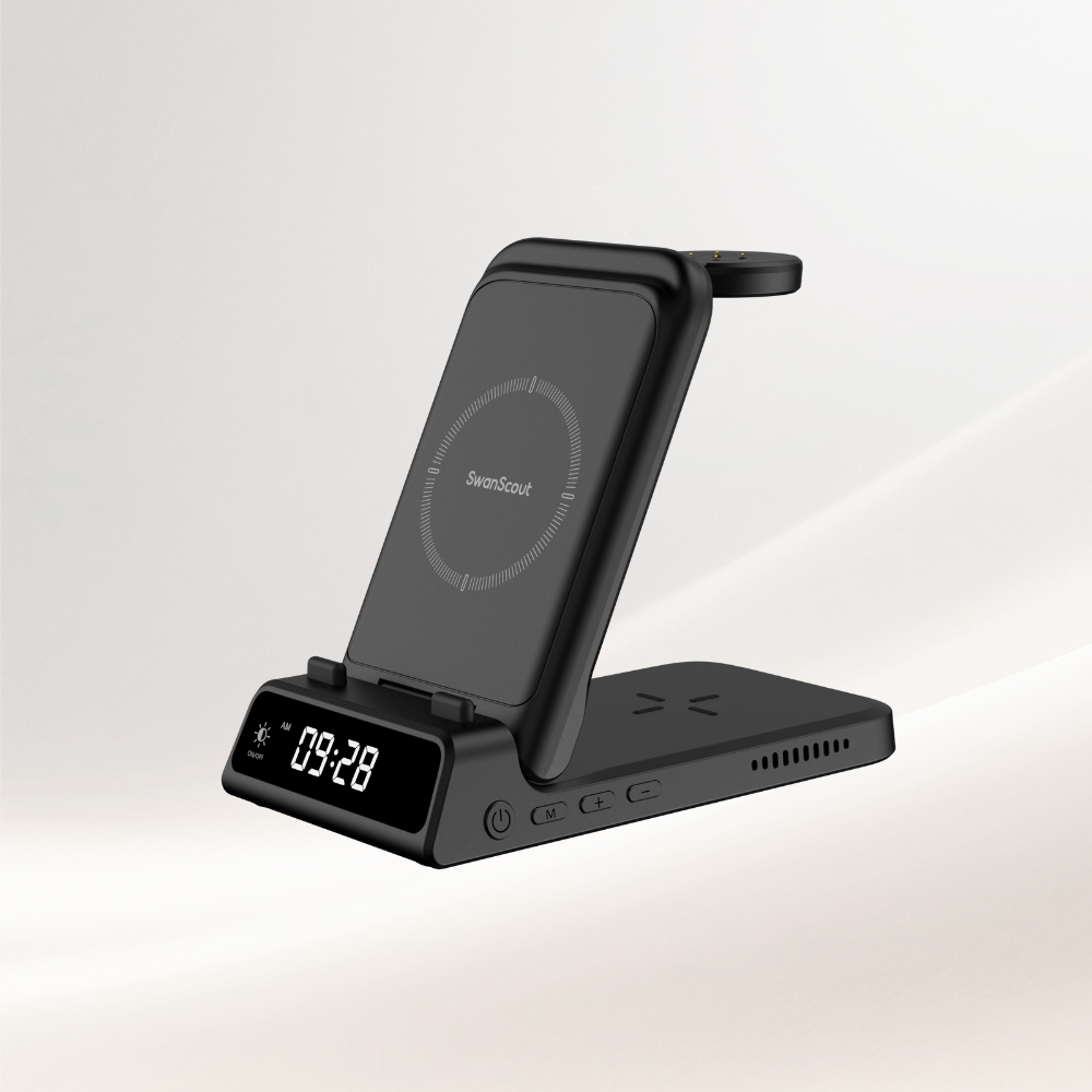 SwanScout 707S is a stable and elegant 3-in-1 wireless charger compatible with Samsung devices.The SwanScout 707S is a sleek Samsung wireless charging station built for daily efficiency and smart device organization.