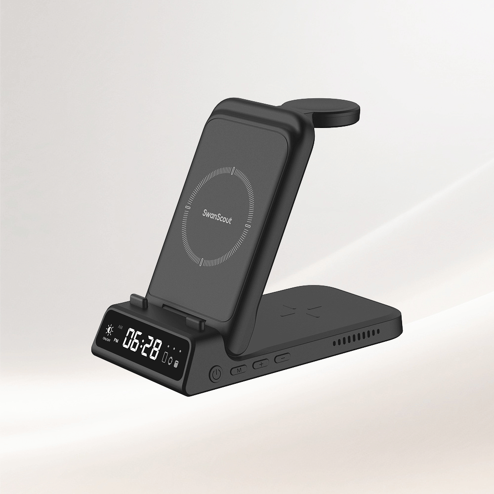 SwanScout 502M is a slim, 2-in-1 magnetic wireless charger compatible with Apple devices.The SwanScout 502M combines a sleek 2 in one clock phone charger design with an LED display and fast charging for daily convenience.