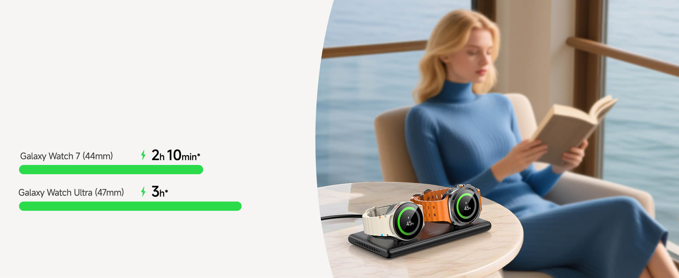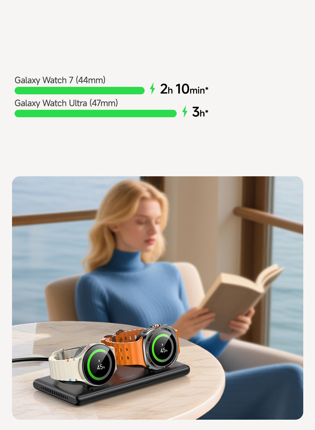 - Carregamento duplo de relógios: Carregue dois Samsung Watches simultaneamente, perfeito para casais ou famílias para carregamento noturno.