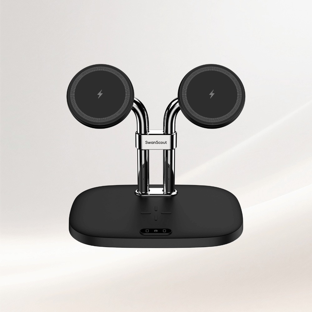 SwanScouts trådlösa laddare omfattar en minimalistisk designfilosofi och kombinerar förstklassiga metallmaterial med raffinerad finish för att ge en elegant textur. Kanterna på metallstället är mjukt rundade och reptåliga, vilket ger utmärkt skydd för dina enheter samtidigt som det förbättrar den övergripande estetiken. Med rena linjer och mjuka toner är dessa laddare inte bara effektiva strömlösningar utan också snygga accenter som lyfter vilket utrymme som helst.