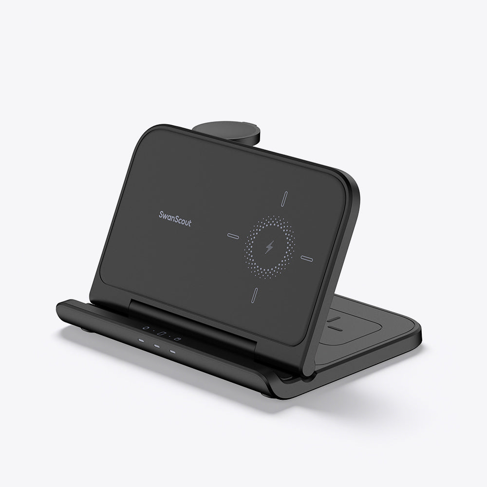 SwanScouts 3-i-1-laddningsstation stöder enheter som inte är från Samsung och som är kompatibla med trådlösa laddningsstandarder (t.ex. utvalda iPhones eller Android-telefoner och trådlösa öronsnäckor) för telefon- och öronsnäcksområdet, men klockområdet är exklusivt för Galaxy Watch. För magnetisk laddning kräver Samsung-telefoner ett magnetiskt fodral för att säkerställa korrekt laddning.