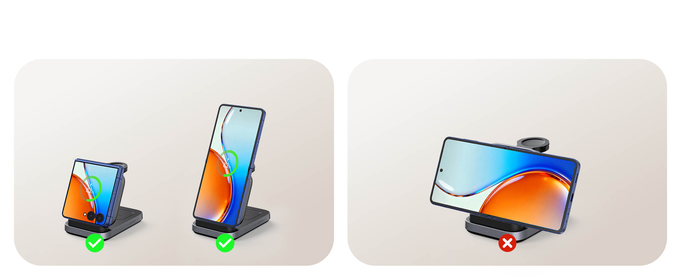• Fodralvänlig laddning: Ladda utan att ta bort fodralet. Fungerar smidigt med de flesta skyddsfodral under 5 mm (0,2 tum). För optimal prestanda, undvik metallplattor, magnetiska tillbehör eller kort mellan telefonen och laddaren.
