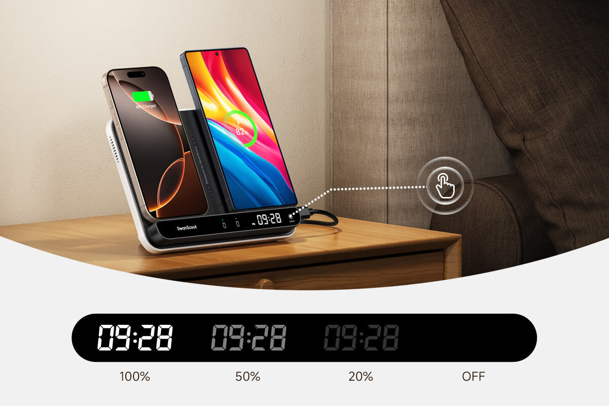 A wireless charging dock keeps your smartphone upright while charging, making it easy to check notifications at a glance.
